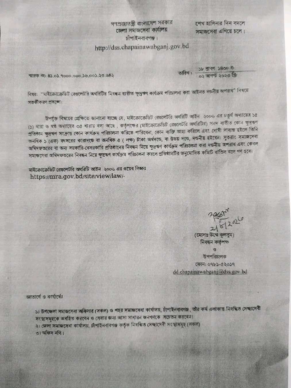 | ১ | মাইক্রোক্রেডিট রেগুলেটরি অথরিটির (এমআরএ) নিবন্ধন ব্যতীত ক্ষুদ্রঋণ কার্যক্রম দণ্ডনীয় অপরাধ বিষয়ে সতর্কীকরণ প্রসঙ্গে | | | ১০-১০-২০২৩ | দেখুন |